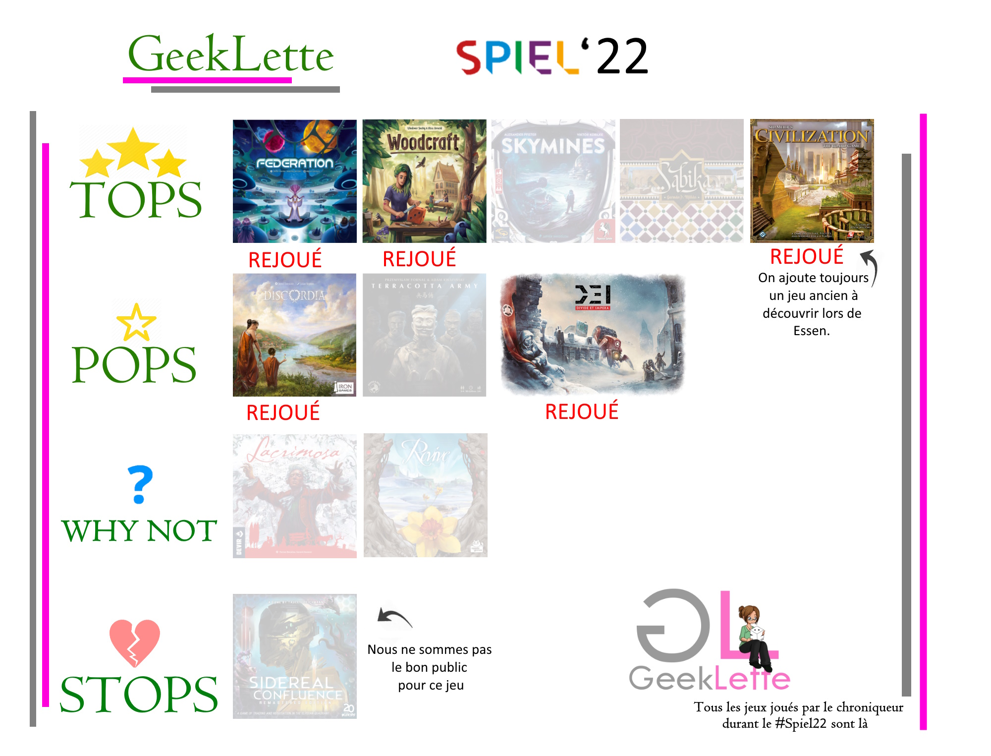 Je ne sais pas si vous me suivez sur les réseaux sociaux, j’avais posté les jeux de Essen 2022 que j’ai gardés et rejoués (image publiée en Juin 2023)