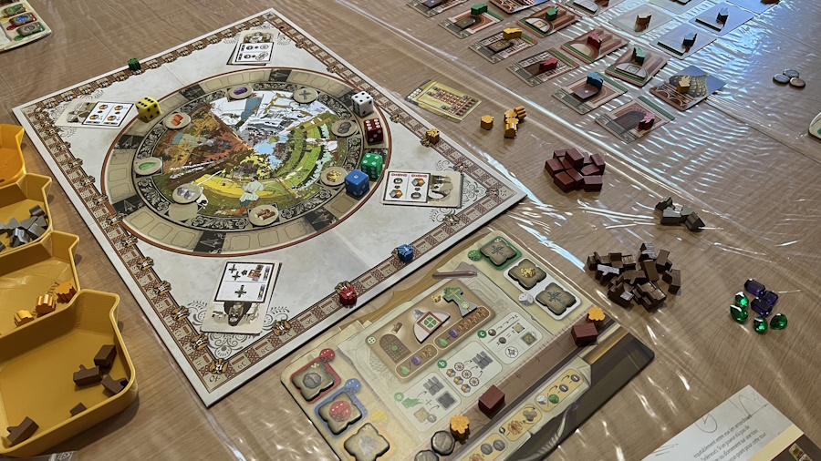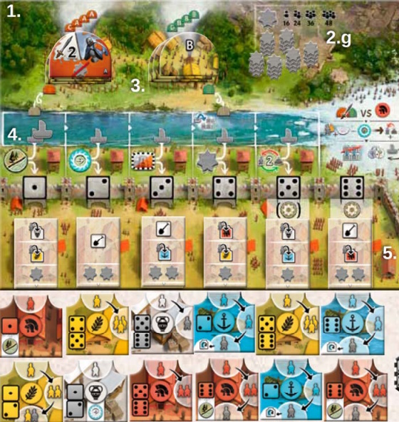 Le premier joueur va changer à chaque fin de manche : celui qui a le plus d’ouvriers restants devient premier joueur. Ce premier joueur lance 3 dés. Sur les 3 dés, il en gardera un que les autres n’utiliseront pas. Il pourra ensuite jouer 1 action en choisissant 1 dé parmi les 3. Les autres joueurs n’auront que 2 possibilités (les 2 dés restants qu’on met sur le plateau sur la case correspondante). On va faire ça 5 fois avant la fin de manche à l’issue de laquelle on devra se battre contre les barbares (avoir suffisamment de points de défense dans les bâtiments rouges remplis) et on récupérera aussi des meeples supplémentaires !