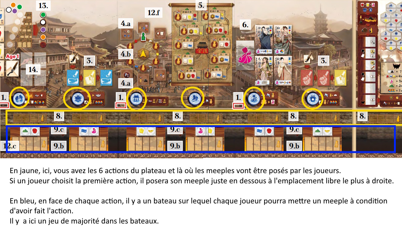 - Après la phase de revenu, on a la phase la plus importante du jeu, la résolution des bateaux. Et de la droite vers la gauche, chaque joueur, ayant activé l’action, va poser un petit meeple sur le bateau correspondant. Et TOUS les bateaux vont avancer vers la droite faisant « sortir » le premier bateau. Ce bateau comporte 2 tuiles. Celui qui est majoritaire sur ce bateau (en cas d’égalité c’est celui qui est le plus devant) va choisir laquelle des 2 tuiles sera utilisée et laquelle sera éjectée du jeu. La tuile choisie sera scorée 3 fois : à la fin de la manche 2, à la fin de la manche 4 et à la fin du jeu (fin de manche 6). Il se passera la même chose à la fin de la manche 2. Le second bateau va amener une tuile de scoring (il y a plusieurs types de tuiles : scoring sur les oeuvres publiées, l’argent conservé, le voyage (l’une des actions), …). Et à la fin de la manche 2 on va scorer les 2 tuiles posées (celle de la 1ere manche et celle de la seconde manche). Et c’est pareil en manche 4. On va scorer les 4 tuiles posées lors des fins de manches 1 à 4. Donc il faut faire attention à ce qu’on laisse aux autres et ce qu’on a pour nous.