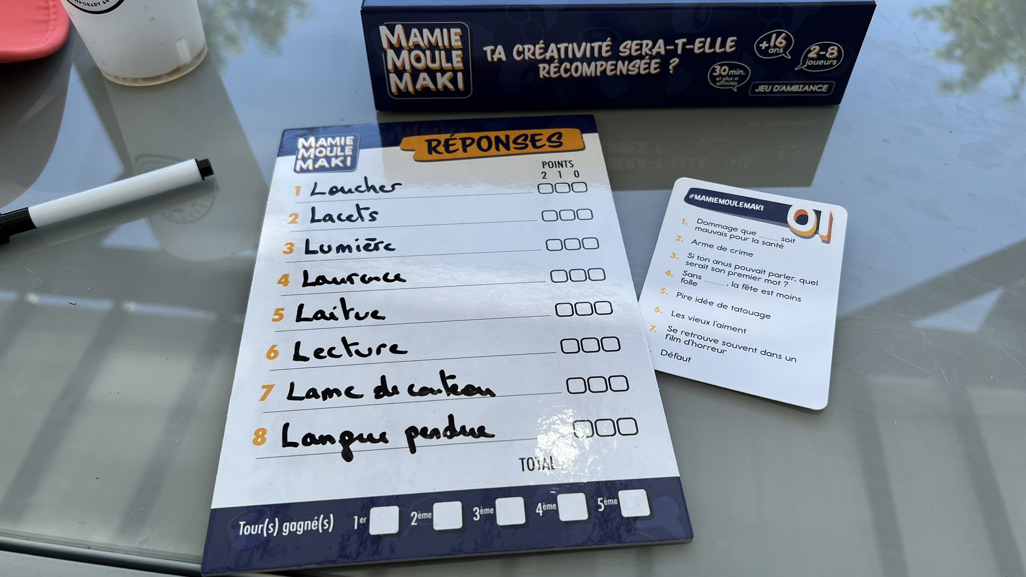 Sincèrement on s’est bien marré. Après, le prix reste élevé (surtout vu le peu de cartes questions… qu’on aimait bien découvrir), mais le plus sympa est aussi de créer ses propres questions : chose que nous avons fait (car les cartes de base n’ont pas suffi). Questions qui se réfèrent aux jeux au sens large :
