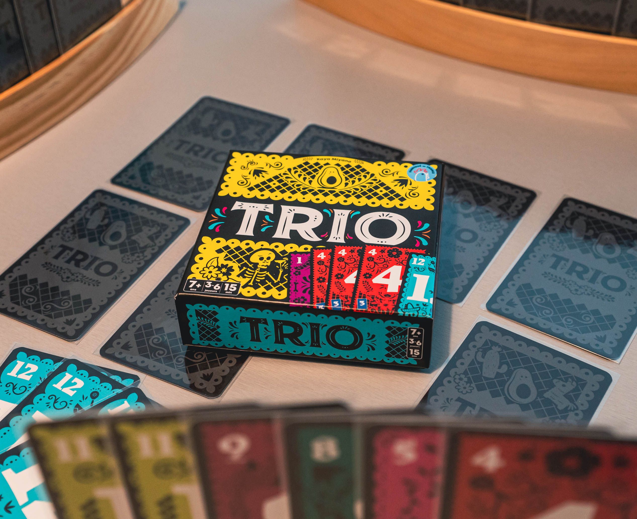 Trio est composé de 36 cartes de 1 à 12. En 3 exemplaires chacune. L’objectif est de trouver les trois cartes d’un même chiffre. Chaque joueur dispose de X cartes en main (X dépendant du nombre de joueurs). Et on dispose X cartes face cachée sur le centre de la table. A son tour un joueur peut faire autant d’actions qu’il le veut TANT QUE il ne dévoile qu’un seul et même chiffre pendant son tour (si un joueur montre une carte 1, puis une carte 2 c’est perdu, c’est au tour du joueur suivant).