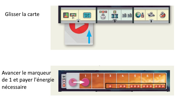 - Actions : chaque joueur, à tour de rôle, joue 1 action, jusqu’à ce que tout le monde ait passé. Il y a deux modes de jeux (soit vous utilisez les cartes comme des marqueurs soit vous lisez leur texte). A son tour, un joueur va placer une carte sur un groupe d’actions qui comporte l’action qu’il souhaite exécuter, il avance ensuite son marqueur d’actions de 1 et il exécute l’action. Le marqueur d’action permet de limiter le nombre d’actions par manche (car plus vous jouez d’action, plus vous en paierez le coût en énergie).