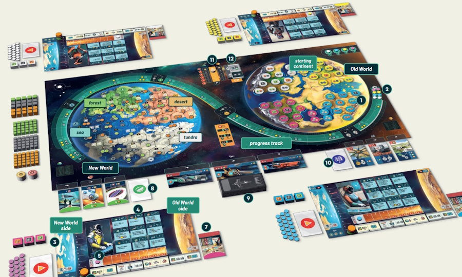 Les joueurs ont 4 ans avant que l’ancien monde ne devienne inhabitable (monde de droite sur l’image du plateau). Ils ont 4 ans pour faire du nouveau monde un monde accueillant mais surtout productif en essayant d’évacuer le plus de sites possibles.