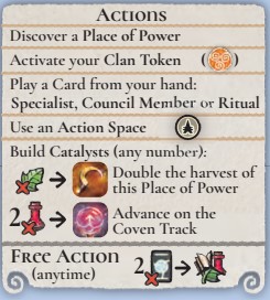 - Jouer une carte de sa main (spécialiste, membre du conseil ou rituel mais ce dernier doit être placé sur un lieu de Pouvoir),