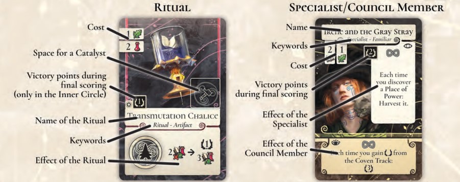Les joueurs jouent des clans de sorcières qui lancent des rituels avec l’aide de spécialistes et de membres du conseil.
