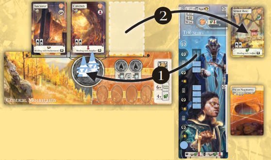 - Placer un ou des meeples sur un emplacement unique & libre et activer l’action (emplacement qu’on trouve sur son propre plateau – rituels, ou sur le plateau principal – dans les régions, mais pas l’emplacement pour récupérer un lieu),