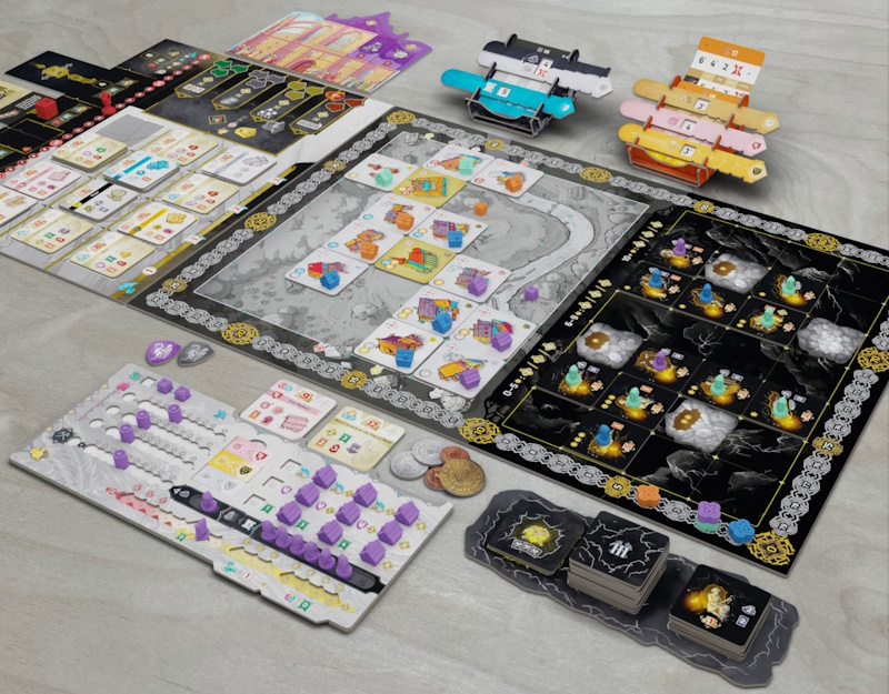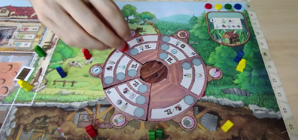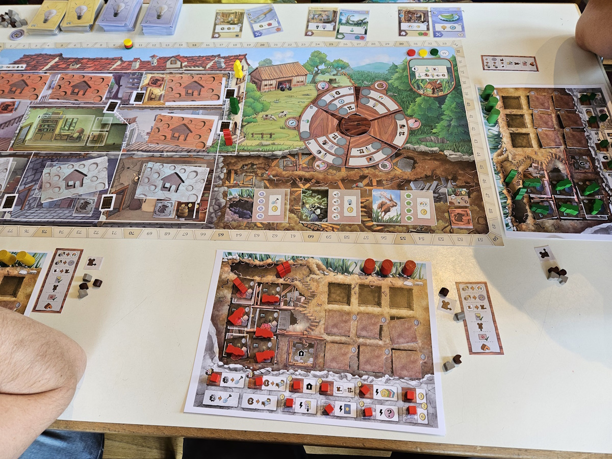 Ce jeu de placement d’ouvriers propose une mécanique originale : à son tour, un joueur va poser un pion sur une case disponible. Cette case se trouve dans un secteur qui va tourner et se retrouver en face de certaines zones et ces zones sont soit sous terre soit sur terre, à la lueur du jour. Le joueur fera ensuite l’action de la case et l’action principale du secteur. Petit twist : la force de l’action du secteur dépendra des ouvriers que le joueur a dans la zone adjacente.