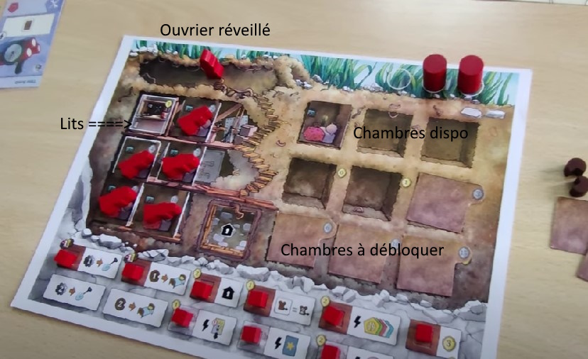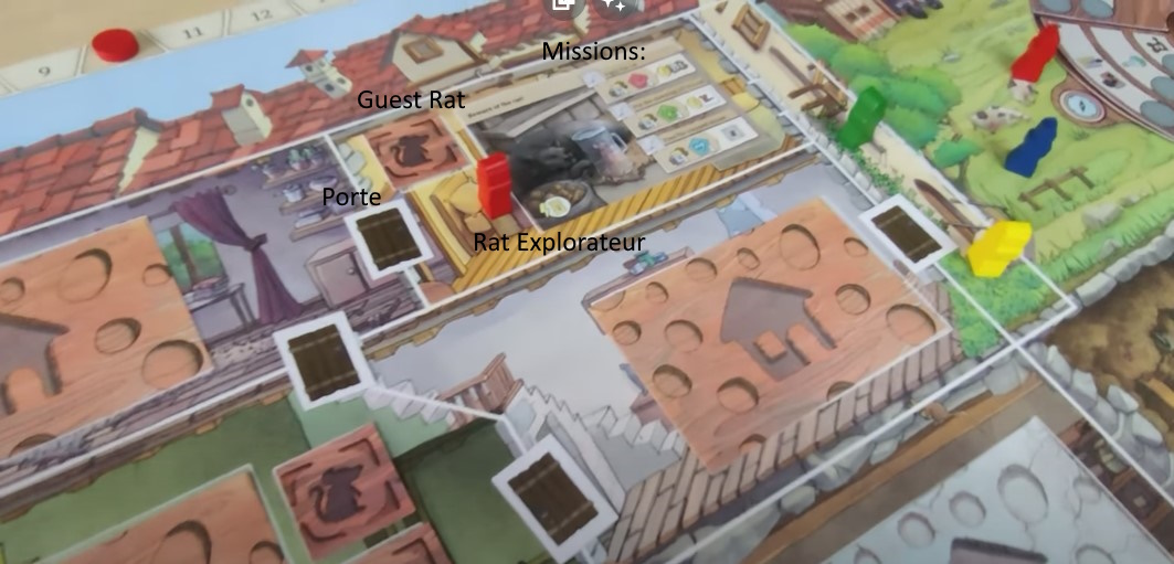 – Explorer la ferme (plateau principal) avec un ouvrier Rat Explorateur. Grâce aux points d’exploration, vous pourrez ouvrir des portes qui donnent des bonus immédiats, déplacer votre Rat Explorateur d’une pièce à l’autre, rencontrer des guests Rats (^_^) que vous mettrez dans une chambre libre, vous pourrez aussi interagir avec la pièce qui donne des missions contre des bonus.