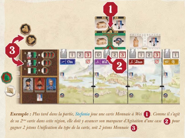 Toute décision de pose (que ce soit des cartes ou des « meeples ») semble importante pour l’issue de la manche car les conquêtes de régions se jugent à chaque fin de manche : le gagnant obtient un token qui double les PV d’une carte et tous les valeureux combattants repartent avec des bonus qu’ils ont anticipé (les bonus sont visibles : à vous de voir si vous voulez dépenser du mana pour les atteindre).