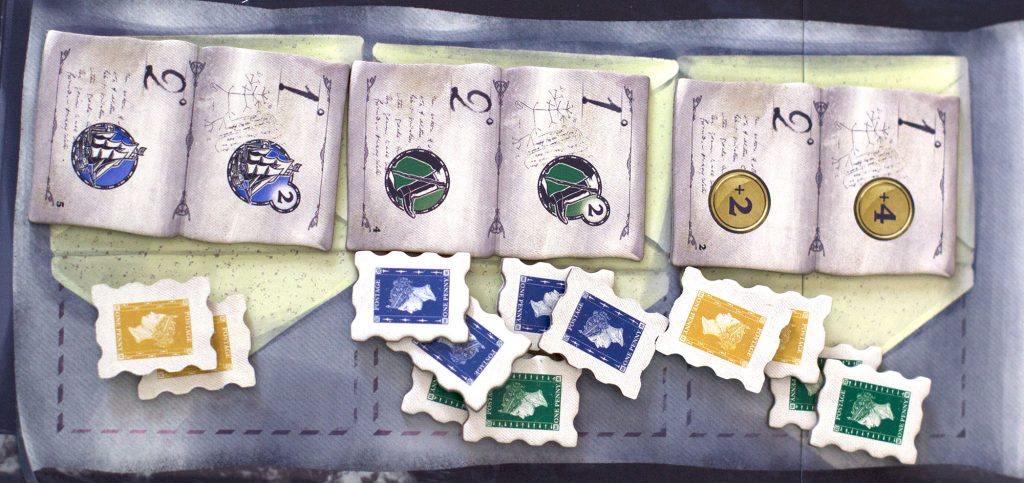 On ne fait pas forcément les bons choix non plus la première fois. Il est par exemple indispensable de se rendre sur les tuiles Correspondance le plus tôt possible dans la partie. Les majorités obtenues sur ces tuiles influencent de manière centrale le déroulement de la partie pour les joueurs, surtout que l’on ne retire que la moitié des timbres après une récompense obtenue: une partie reste donc en place pour le tour suivant.