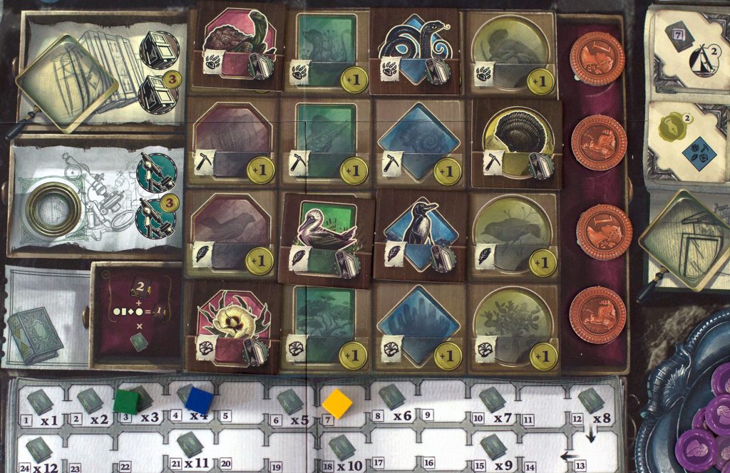 Si l’apport de points de victoire se fait essentiellement sur la livraison de spécimens (et la piste de l’évolution), il y a moyen de gratter des points d’autres manières: les objectifs Beagle, les points en exploration ou navigation, ou encore en débloquant des cases sur son plateau personnel.