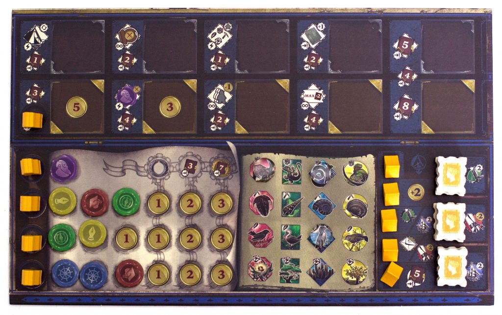 Le matériel est de bonne qualité, et je trouve les illustrations superbes. Dernier point positif côté matériel: la boîte de jeu est bien remplie mais surtout, elle est moins profonde que d’autres jeux experts avec beaucoup de matériel.