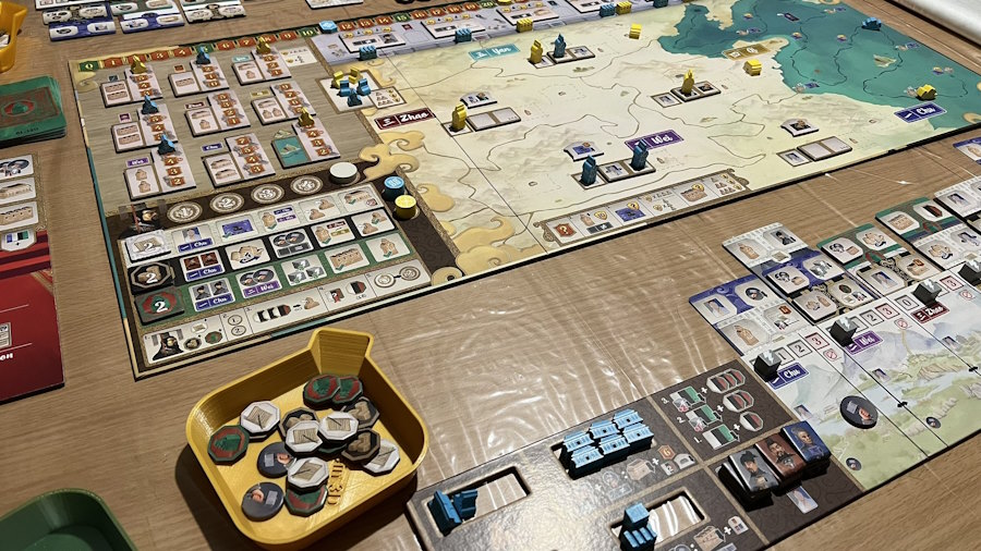 Ca a cramé notre cerveau ! On a démarré les règles vers 21h (erreurrrrrrrrrrrrrrrrrr) du coup on a eu deux manches difficiles sur 5. Mais cela prouve bien qu’il a quelque chose sous le capot. Tout s’imbrique et tout combote, et tout est question de course : être le premier sur les objectifs (pour + de PV), être le premier sur le plateau (pour choisir le bonus), être le premier sur les murailles (pour la tuile bonus et avoir la meilleure place pour scorer +), être le premier sur les palais dans chaque région (pour gagner la tuile PV), être le premier sur les catégories (écriture, monnaie, loi) pour avoir des actions supplémentaires gratuites souvent, etc… Il faut être partout (ou pas?! c’est ma première partie).