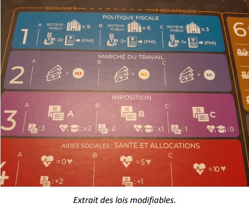 • Phase d’élections : C’est le moment de voter les lois qui seront à votre avantage. Personne bien sûr n’étant sur la même longueur d’onde, il vous faudra jouer de toute votre influence sur les responsables politiques. Moment assez sympa où vous risquez de perdre vos amis. Le tableau des lois est super bien pensé à la fois en terme de jeu et en terme de réalité socio-économique. Je le redis, surtout concernant les politiques en cours, la fin du jeu arrive très vite. Sur 5 manches vous ne pourrez au final influer que 3 manches sur les politiques. Hors, cette phase est majeure pour votre scoring.