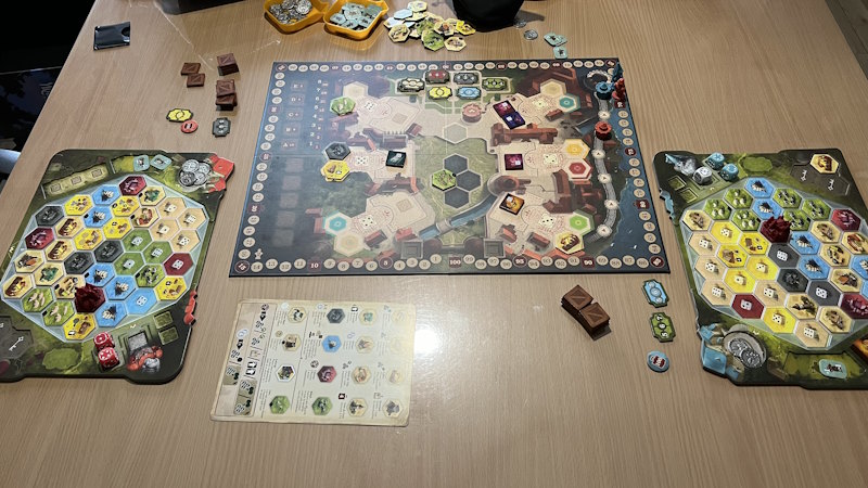 Un jeu auquel j’ai gagné une seule fois. Mon cerveau n’est pas taillé pour lui. Il faut occuper (éliminer) ses ouvriers et celui qui réussit à se débarrasser de tout le monde gagne la partie. Et je dois être la seule à finir la partie avec plus d’ouvriers qu’en début de partie. Oui, oui… je sais pas, je n’y arrive pas. Mais comme si ça suffisait pas, j’en redemande ! Et avec l’extension, je me suis dit « top, peut-être que les plateaux asymétriques et les bâtiments partagés m’aideront » => pas du tout. L’essence du jeu est la même et si t’es nul au jeu de base, tu seras nul avec l’extension. On a bien ri.
