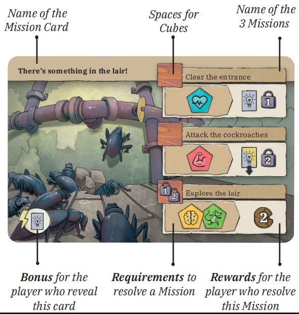 - placer un cube sur une mission disponible pour vous (c’est à dire que votre explorateur doit se trouver dans la pièce ou bien que votre tente y soit – oui en quittant une pièce vous pouvez y installer une tente, mais vous n’en avez que deux) et vous devez remplir les conditions. Le jeu impose de poser un cube par mission, donc premier arrivé, premier servi. La carte ci-dessous par exemple nécessite d’avoir un badge bleu sur ses cartes jouées pour placer un cube. Le gain est d’obtenir une carte de niveau 1 (carte grise-bleue) et ça débloque la mission 3. La mission 2 nécessite d’avoir un badge rose sur ses cartes jouées. Le gain est de jouer une carte et elle débloque la mission 3. La mission 3 elle nécessite 2 badges (et les deux premières missions doivent avoir été accomplies) et le gain est 2 bois.