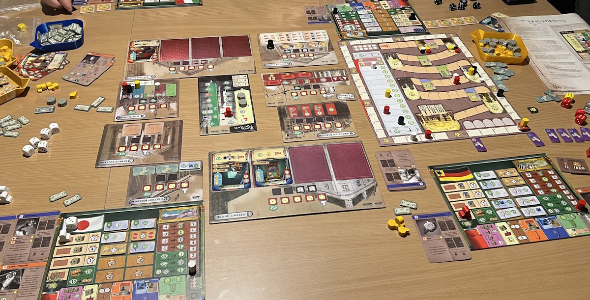Bref, Crystal Palace propose aux joueurs compétitifs de jouer une des nations participantes à l’expo. Ce que j’aime bien dans ce jeu, c’est que non seulement le placement de dés est tordu à 4, il n’y a pas de place pour tout le monde (et parfois même vous devrez payer plus cher si votre dé est trop bas lol) mais en plus, choisir la valeur du dé en fonction de ses finances propose tout un tas de dilemmes qu’on aime bien voir nous, euro-gamers (oui oui de temps en temps…)