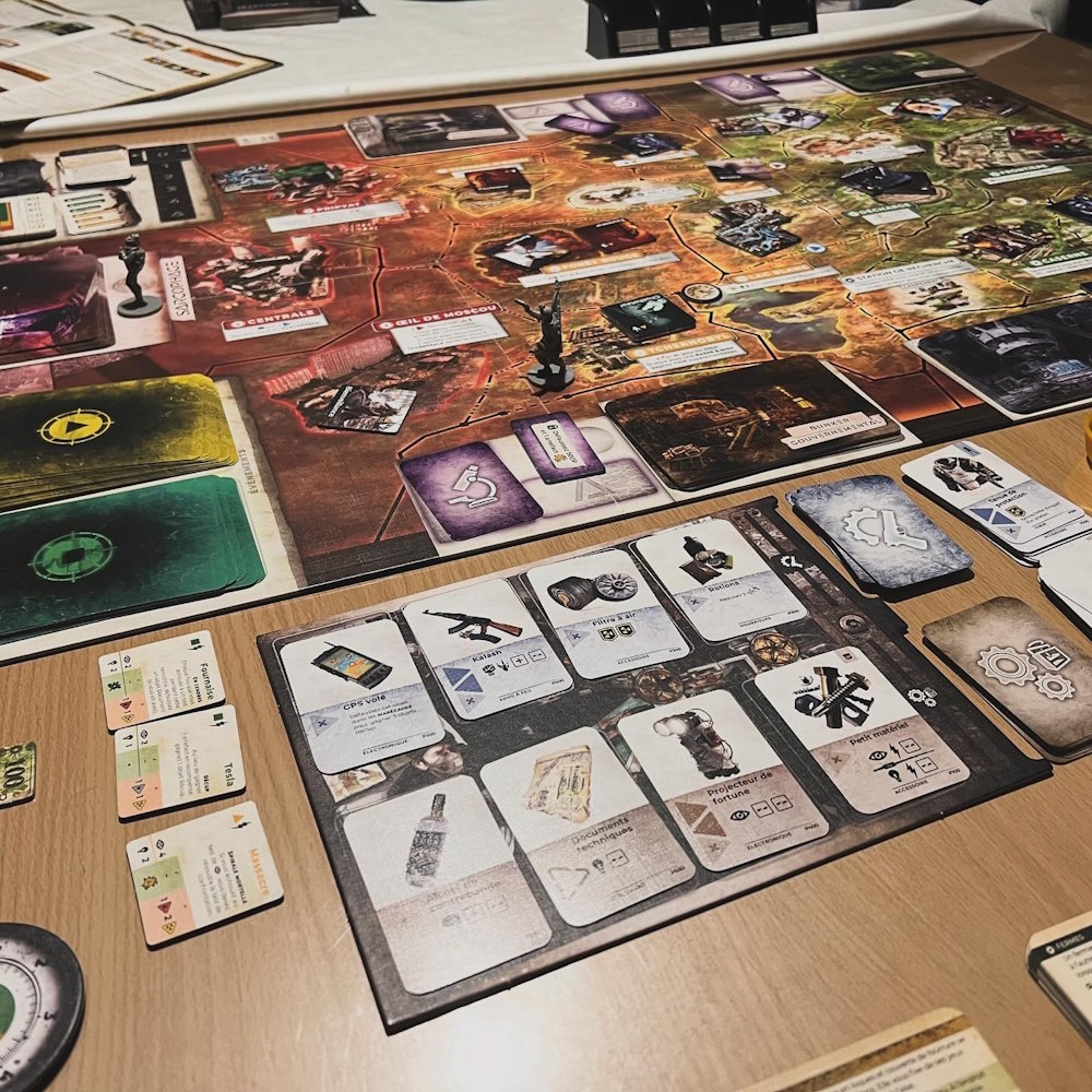 Maintenant que j’accorde plus d’importance au thème, j’ai voulu réessayer. Et grand bien m’en a fait, car à deux, ça reste long (ça devrait être moins long au fil des parties), mais ça marche très bien ! J’ai beaucoup aimé. Mécaniquement simple, à votre tour vous choisissez de faire deux actions (déplacement, action du lieu…). Sauf que ce n’est pas si facile que ça. Car vous devrez aller chercher 2 secrets dans des planques (les réussir, à la façon d’un jeu de rôle, selon vos caractéristiques et lancers de dés) avant de vous rendre dans la zone de la centrale pour ouvrir le sarcophage et réussir une nouvelle mission. Evidemment, en chemin, vous ferez quelques rencontres … parfois dangereuses.