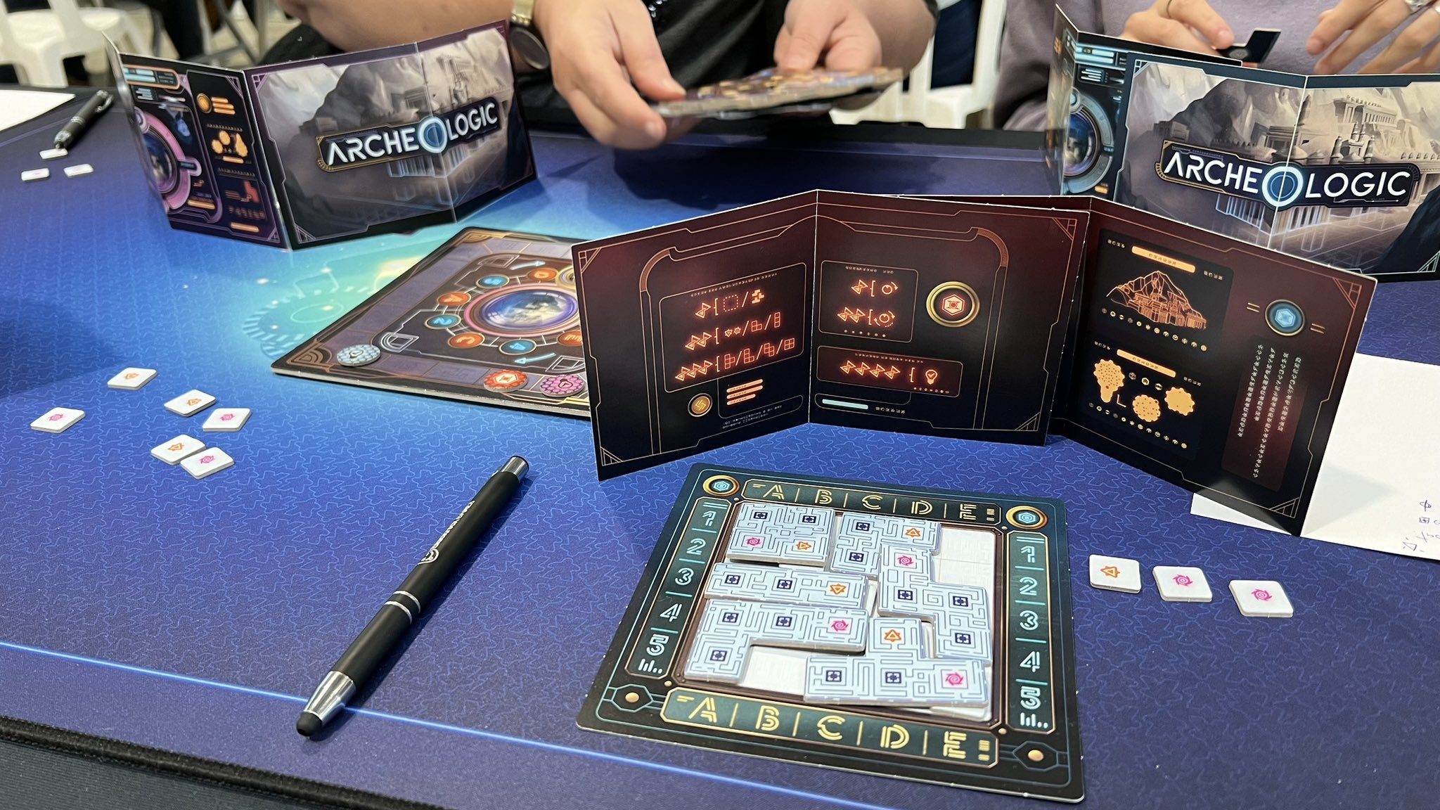 - ArcheOlogic: Jeu de déduction. Je lui préfère « A la recherche de la Planète X » (mon chéri de toujours) mais j’ai passé un très bon moment. On doit placer les pièces d’un donjon (à la Tetris) en fonction des indices/réponses aux questions. La machine qui répond est très bien conçue et on évite ainsi l’application mobile. On a démarré avec beaucoup d’indices, ce qui a permis de rapidement terminer la partie (4 tours). Je ne serai pas contre de réessayer avec une difficulté supérieure. Ce que j’ai beaucoup aimé (et qui m’a freinée aussi, parce que la déduction s’en trouve effacée) c’est que les pièces de Tetris doivent être posées selon les indices et réponses aux questions. OK. Sauf que pendant que les autres jouent, on peut commencer à essayer de placer ces pièces dans le donjon et on va vite s’apercevoir que TOUT ne rentrera pas et qu’au final, il y a UNE seule configuration dans laquelle tout rentre. La configuration gagnante. (évidemment quand on a suffisamment d’indices). Mais du coup, on arrête de poser les questions, ce qui veut dire arrêter de déduire : c’est cela qui m’a gênée. Le placement des tuiles pour « tester » met fin à la déduction et à la partie. Ca rend le jeu plus fun, car on manipule, on tourne les pièces dans tous les sens… soyons honnête et ça rend le jeu plus concret, mais la partie déduction est trop importante pour moi. Du coup, j’ai acheté Temple Code du même auteur, Yoann. Arrivera-t-il à détrôner la planète X ?
