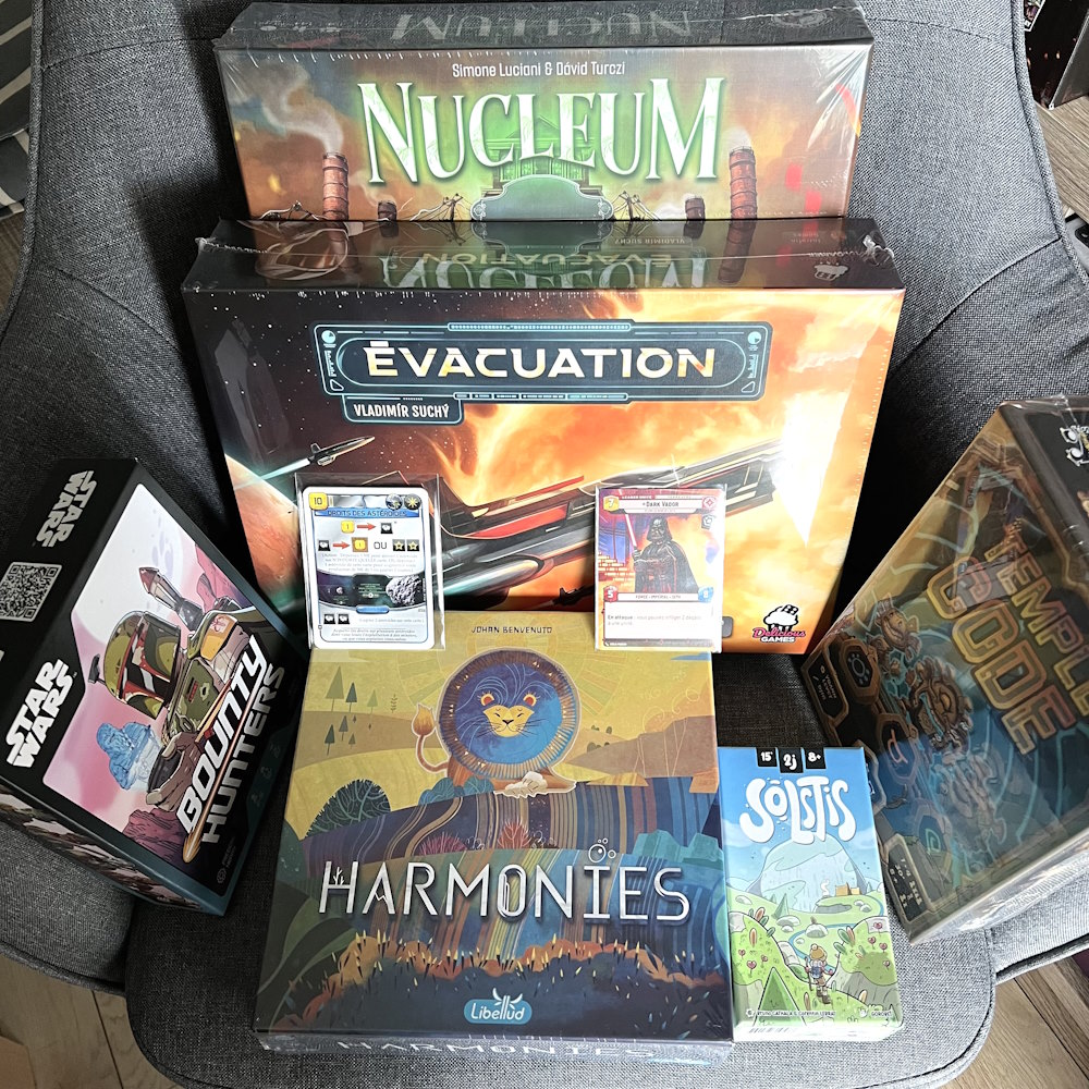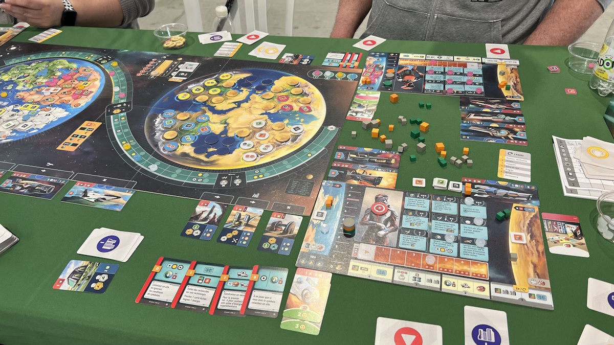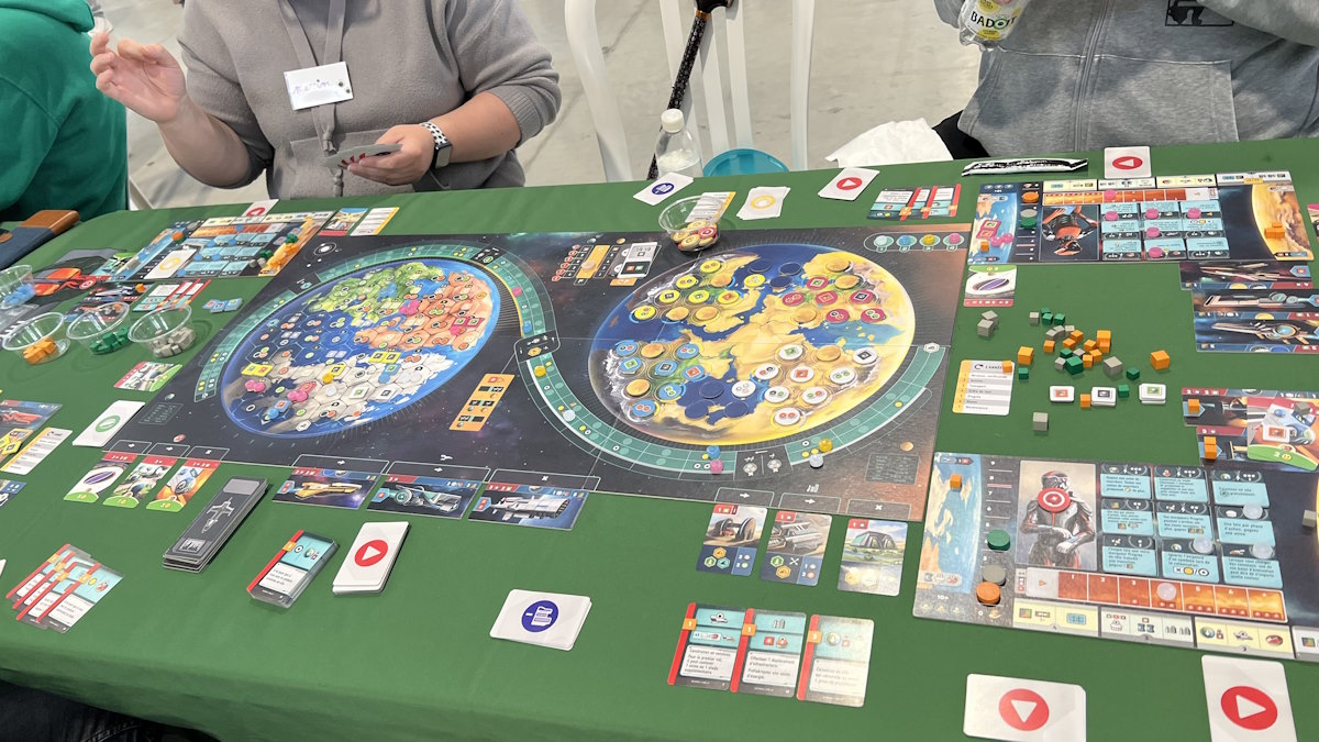 Envie de rejouer ? oui très envie, j’ai acheté le jeu sur le festival. Et d’ailleurs, tout au long de la partie, je me disais que les mécaniques servaient le thème. On fait des actions qui rappellent sans cesse le thème : construire un vaisseau, le charger, lui donner de l’énergie pour partir, construire des bâtiments / infrastructures, évacuer les populations qui produisent aussi mais également les infras, développer nos technologies, … Tout rappelle le thème. En plus, la mécanique est simple (poser une carte pour son action). C’est y jouer qui n’est pas simple. Mais tout est là pour apprécier le jeu : thème, mécaniques, visuels, … Je ne vais pas me priver de rejouer, en plus l’acheter sur le festival m’a donné l’occasion de discuter avec Thomas, du Passe Temps.