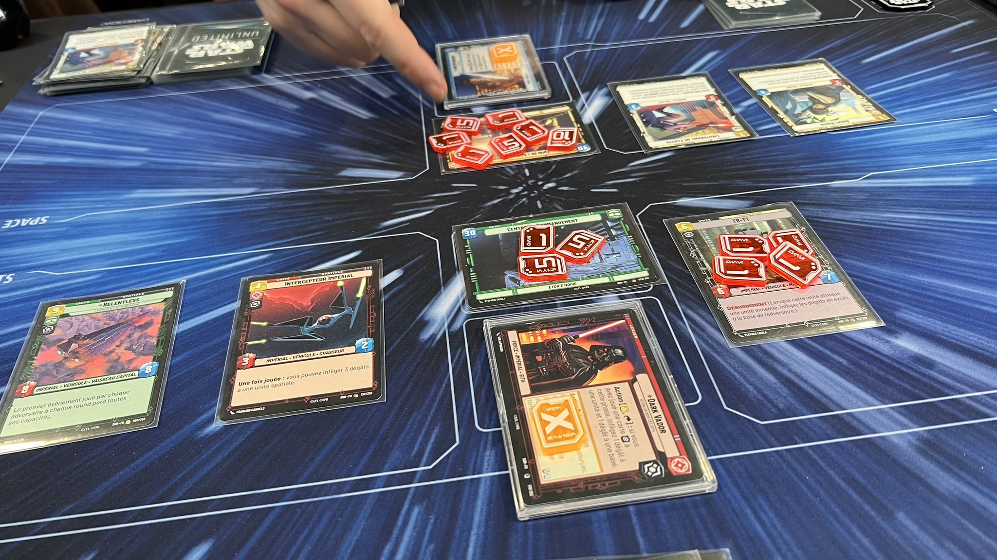 - Star Wars Unlimited: j’étais contente de jouer Dark Vador et j’ai gagné mais le début a été compliqué pour moi, je défendais plus que je ne jouais… Et ça a été au tour de mon adversaire, de se défendre, encore et encore… Du coup, on n’a pas trouvé ça fun. Il faut dire qu’on ne connaissait pas les cartes non plus. Alors, vu le succès, on n’est simplement pas fait pour les jeux d’affrontement, j’imagine. Par contre, on a entraperçu les promesses du jeu, les cartes qui doivent être jouées avant / après d’autres, les synergies entre elles, … C’est peut-être ça qui donnerait envie d’y retourner mais les tables étaient pleines. Et j’avoue avoir beaucoup aimé les illustrations.