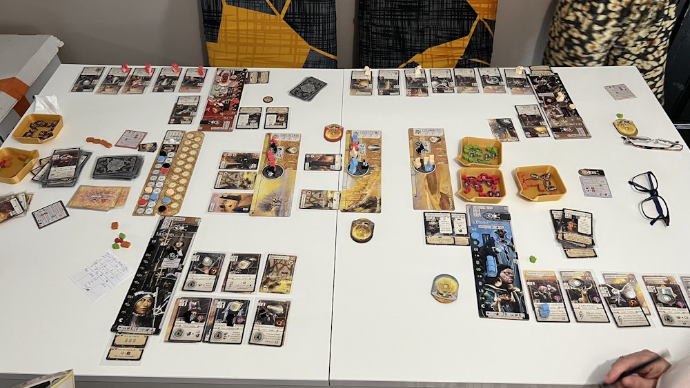 Malgré un thème que nous trouvons absent, il faut bien admettre que la mécanique est d’une solidité incroyable. La frustration est bien présente lorsque les numéros de cartes ne vont pas dans votre sens. Les numéros des cartes ne vous empêchent pas de faire l’action mais ils peuvent vous empêcher de la bonifier (c’est judicieux et extrêmement malin, malgré les gros mots qu’on peut dire autour de la table lol).
