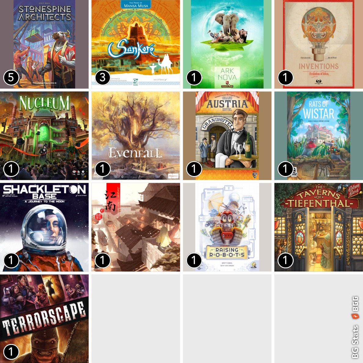 Les jeux joués en Juillet 2024 (Shackleton Base, Sankoré, Terrorscape, Stonespine Architects, Inventions, Erudits)