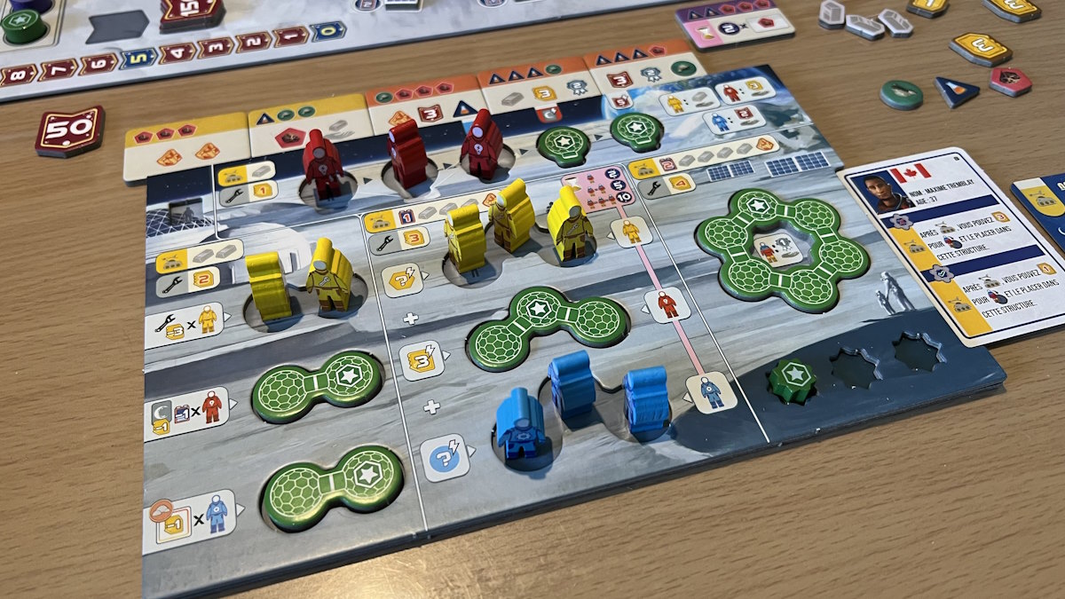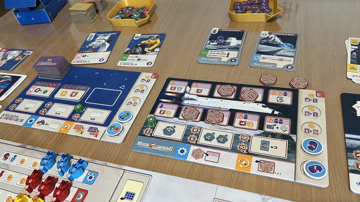 • sur le portail lunaire où il pourra, contre un meeple, gagner un peu d’argent, activer une action, et surtout récupérer un autre meeple que celui posé qu’il devra placer sur sa base (pour des PV de fin de parties, des améliorations d’actions, des réductions de coûts, des revenus supplémentaires en ressources, argent et/ou PV).