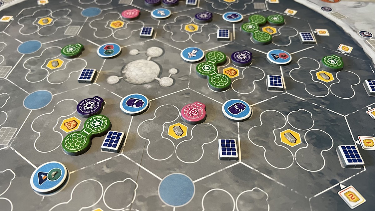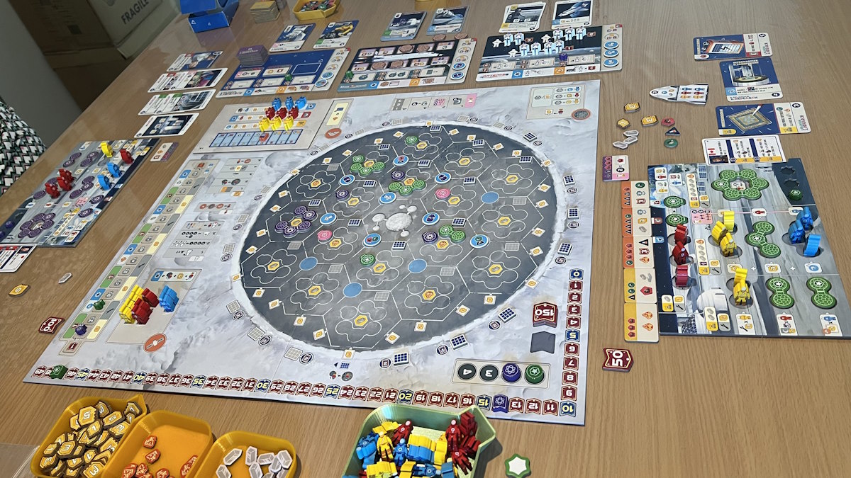 • Quand vous placez un meeple sur le cratère, vous allez devoir payer les adversaires (selon condition) dans les secteurs activés. Du coup, vous espérez que les autres viennent activer vos secteurs mais si vous en faites trop, ils ne viendront pas, sauf que vous voudriez les activer pour vous, pour optimiser l’action cratère. Les choix sont cornéliens.