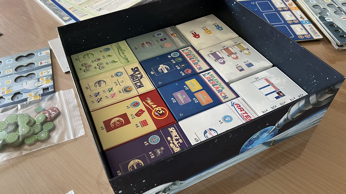 • Navette (on va choisir une navette contenant 6 meeples de couleurs différentes, des ressources et de l’argent). Plus votre navette est intéressante, plus vous jouerez dernier.
