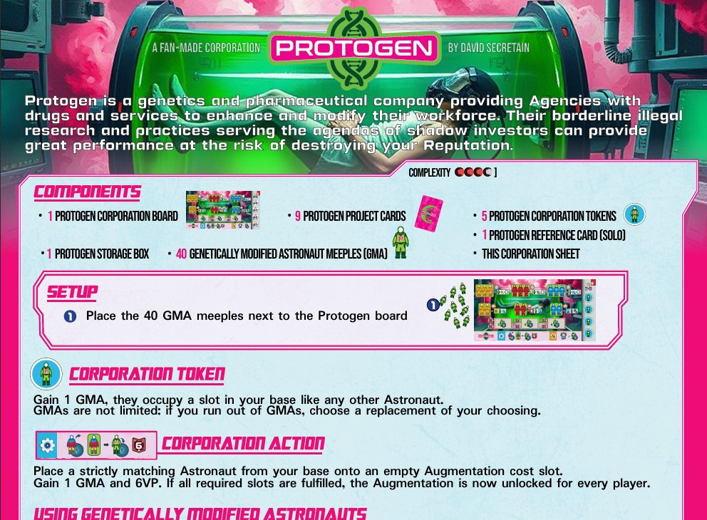 Une corporation qui permettrait d’obtenir un nouveau type d’ouvrier vert/violet/orange qui compterait, selon les besoins du joueur, comme un ouvrier bleu ou jaune pour le vert, bleu ou rouge pour le violet et jaune et rouge pour l’orange. On pourrait même envisager un blanc qui remplacerait toutes les couleurs. Ses ouvriers seraient des astronautes sur-qualifiés, d’où leur versatilité.