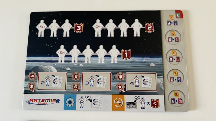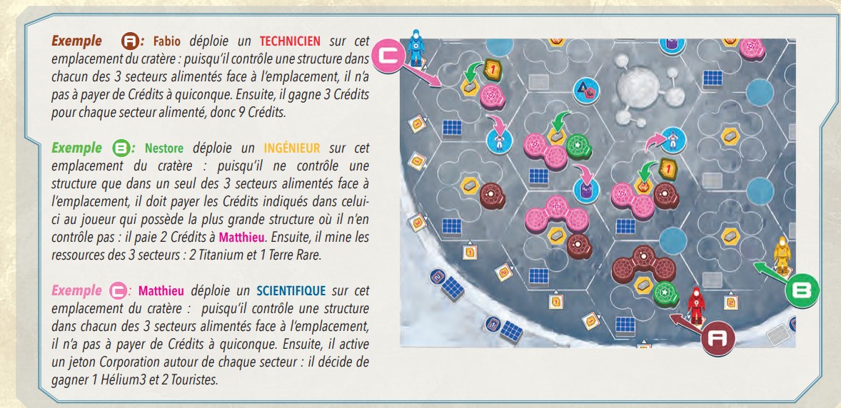 - Sur le portail lunaire, pour échanger un ouvrier contre un astronaute à placer sur sa base (il ne sert pas d’ouvrier) et gagner quelques bonus au passage