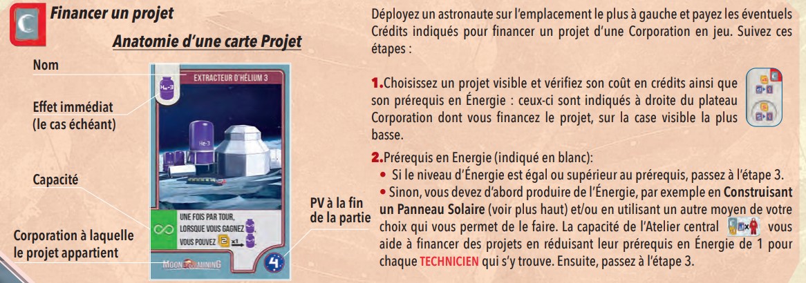 - Financer un projet : il s’agit de récupérer une carte d’une des corporations selon le coût. Vous paierez avec vos crédits et en énergie commune (attention il y a un niveau d’énergie nécessaire par corpo). Plus les joueurs auront mis des jetons corpo sur le cratère, plus les cartes Projet de cette corpo seront chères. Ces cartes apportent des bonus immédiats, de nouvelles actions, des capacités permanentes etc… Hyper dépendant des corpos choisies au début de la partie du coup.