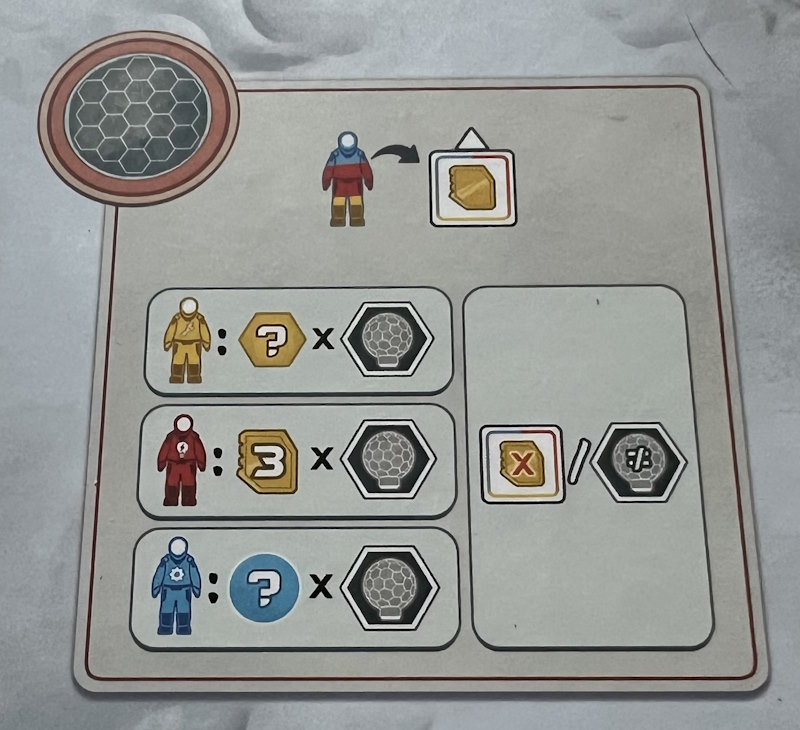 Les Dômes (les plus petites structures, taille 1) vont vous donner des revenus en phase de maintenance (si vous y assignez un astronaute) et je vous le donne en mille, la couleur de l’astronaute est importante : un rouge donnera 3 crédits, un jaune du titanium et le bleu ? des terres rares ? non ! 2 points de victoire (PV) ! La terre rare reste rare ! ne l’oubliez pas !