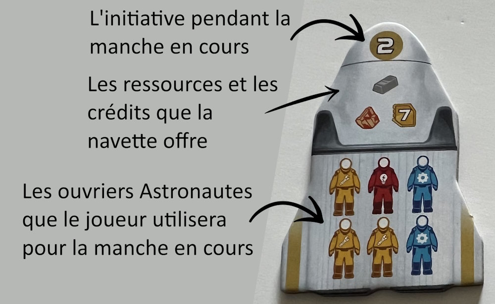 Il y a 5 tuiles Navettes par manche. Vous allez révélez un certain nombre de navettes à chaque manche (nombre de joueurs + 1).