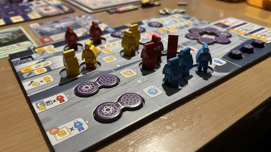 - Si vous déployez un ouvrier bleu (un scientifique), vous activerez un jeton de Corpo pour chaque secteur alimenté. Un jeton ne peut servir qu’une fois, attention.