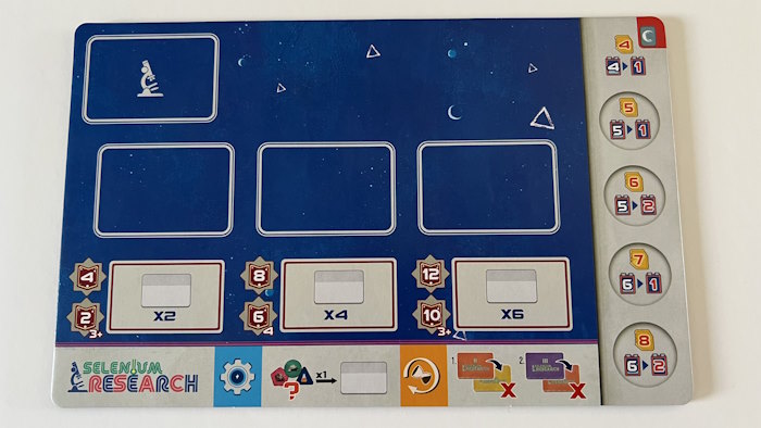 - Selenium Research : vous collectez de nouvelles ressources sur le cratère pour réaliser des expériences qui vous donneront des bonus.