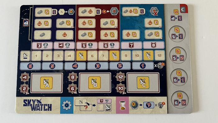 Il y a une action optionnelle qu’on peut faire si on se pose sur le commandement (on peut faire cette action à n’importe quel moment). C’est l’action de construire un panneau solaire en dépensant une terre rare. Les panneaux solaires se trouvent autour du cratère, il faut les prendre dans l’ordre car l’énergie qu’ils produisent n’est pas toujours la même. Et l’énergie du cratère toute entière est une piste commune à tous les joueurs. Si vous êtes trop haut ou trop bas, il y a des conséquences. Par contre, la case d’arrivée vous donne un point de réputation (si ce n’est pas une conséquence de votre abus lol).