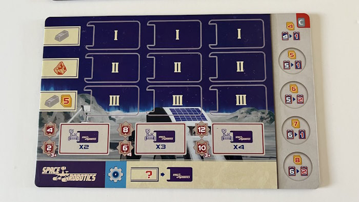 - Space Robotics : vous allez construire des robots qui effectueront des tâches dans les usines qui rapportent des pouvoirs permanents ou immédiats ainsi que des PV en fin de partie