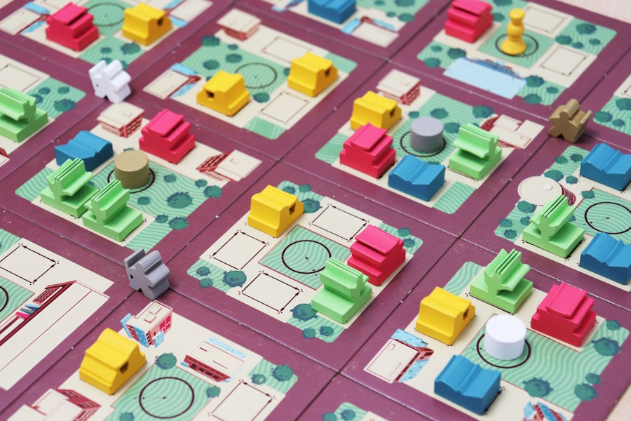 Nous allons construire la ville de Chandigarh, grâce à notre urbaniste. Là encore, un jeu avec des règles simples : à notre tour, nous pouvons soit déplacer notre urbaniste et construire des bâtiments, soit prendre une carte « projet ».  La carte s’ajoute à votre zone personnelle, vous donne des bâtiments et surtout permettra de marquer des PV (selon des agencements de bâtiments dans les quartiers de la ville). Le petit twist : si vous ajoutez une 4eme carte à votre zone, vous devrez alors en défausser une que vous scorez immédiatement. Un jeu qui nous bien plu : rapide à comprendre, pas de temps mort, et mine de rien des choix à faire pour optimiser nos actions sans offrir trop d’opportunités aux adversaires.