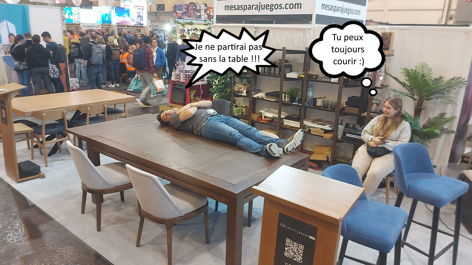 J’ai beaucoup suivi la chaine Youtube officielle du Spiel,  en live TOUTE la journée, et les 2 animateurs n’ont même pas mal à la gorge après 4 jours intensifs, je suis jalouse ! Bref, à force de les suivre, j’ai remarqué que sur certains stands, on avait plus affaire à des vendeurs professionnels qu’à des joueurs. Je m’explique : ils ont été sur 2 stands présentant les tables de gamers. Le premier vendeur a fait le show comme dans une foire (#ohwait), presque je serai repartie avec une table et toutes ses options. Ouf, heureusement, je n’étais pas là bas. Le second vendeur, d’un autre stand était plus timide, peut-être impressionné par la caméra, cependant il transmettait mieux sa passion mais n’avait aucune notion de vente. Je n’aurai pas acheté la table. Je ne citerai pas les noms pour éviter toute gêne (mais vous pouvez vous faire le replay des 4 jours: bon courage lol). J’ai vraiment halluciné parce que du coup, à partir de ça, j’ai fait plus attention aux personnes qu’ils interrogeaient et ça s’est vérifié. Les commerciaux sont dans la place. Tu leur parles d’un jeu qui ressemble aux leurs, ils ne connaissent pas (ou alors c’est une stratégie!). Bref, on est loin des premiers Essen ^^