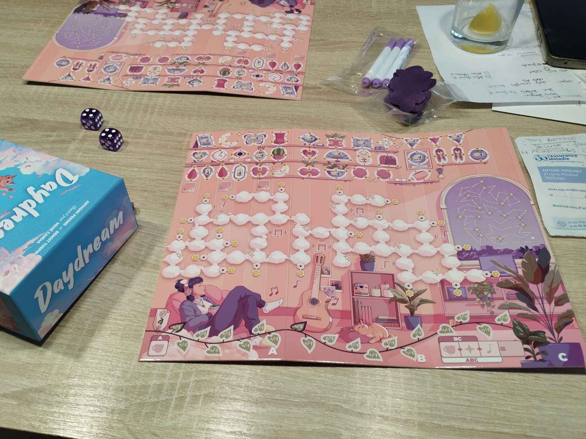 on a fait une pause chill avec Daydream : le jeu se vend sur ce créneau et il le fait bien! on a joué avec la configuration A/B/C, et franchement c’est le genre de machin & write que j’apprécie ; j’aime quand on reste simple sur ce type de jeu.