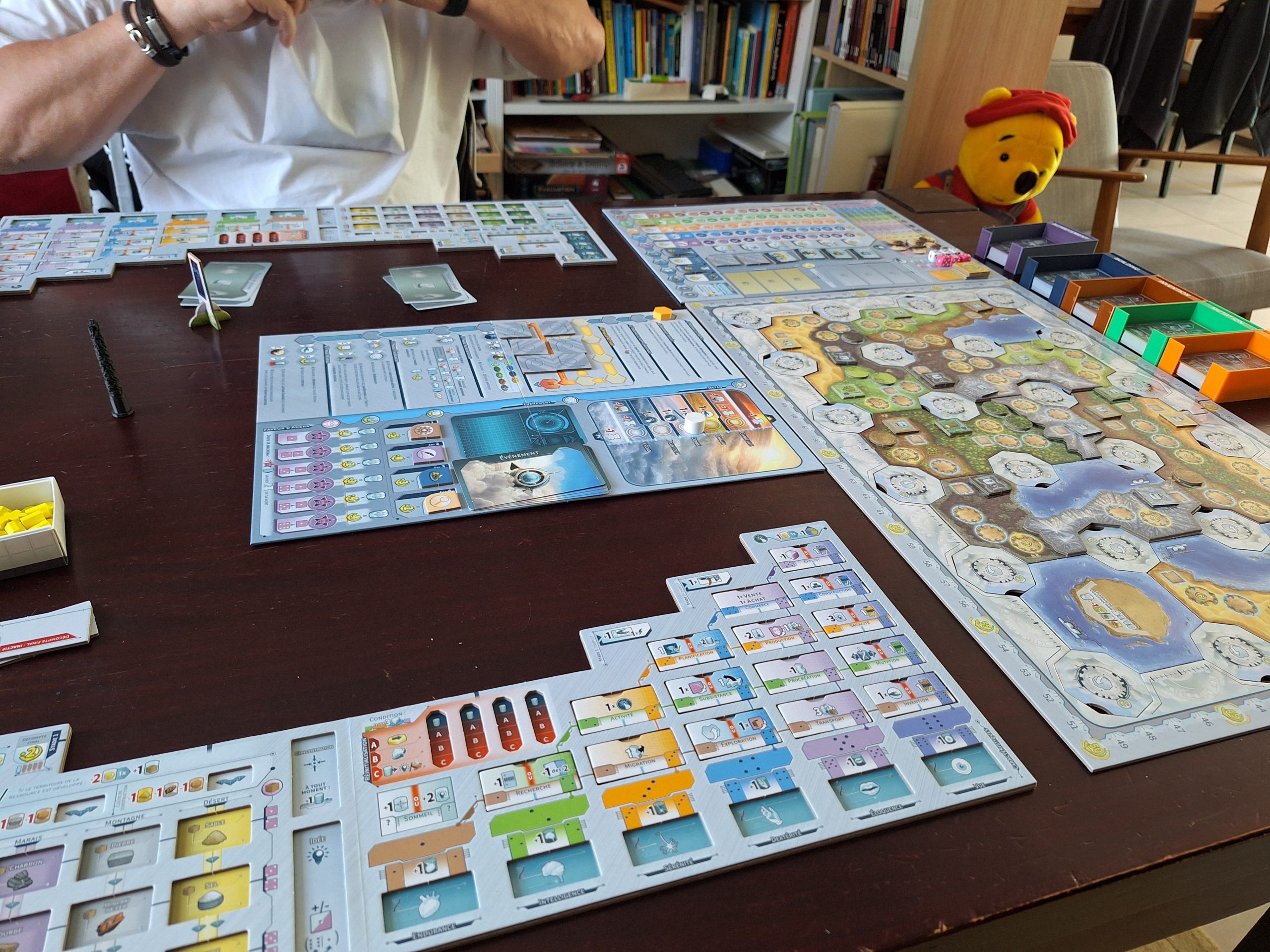On aura ensuite une table suffisamment grande pour installer et jouer une partie de Civolution. Je suis étonnée de la fluidité de la partie malgré un plateau d’actions assez dense… il faut bien cette première partie pour comprendre toutes les imbrications des choix et des actions. Je ressors de la partie avec un sentiment de frustration, j’ai trouvé que j’avais pu jouer peu de cartes à mon goût, mais très contente de cette découverte qui donne envie d’y rejouer.