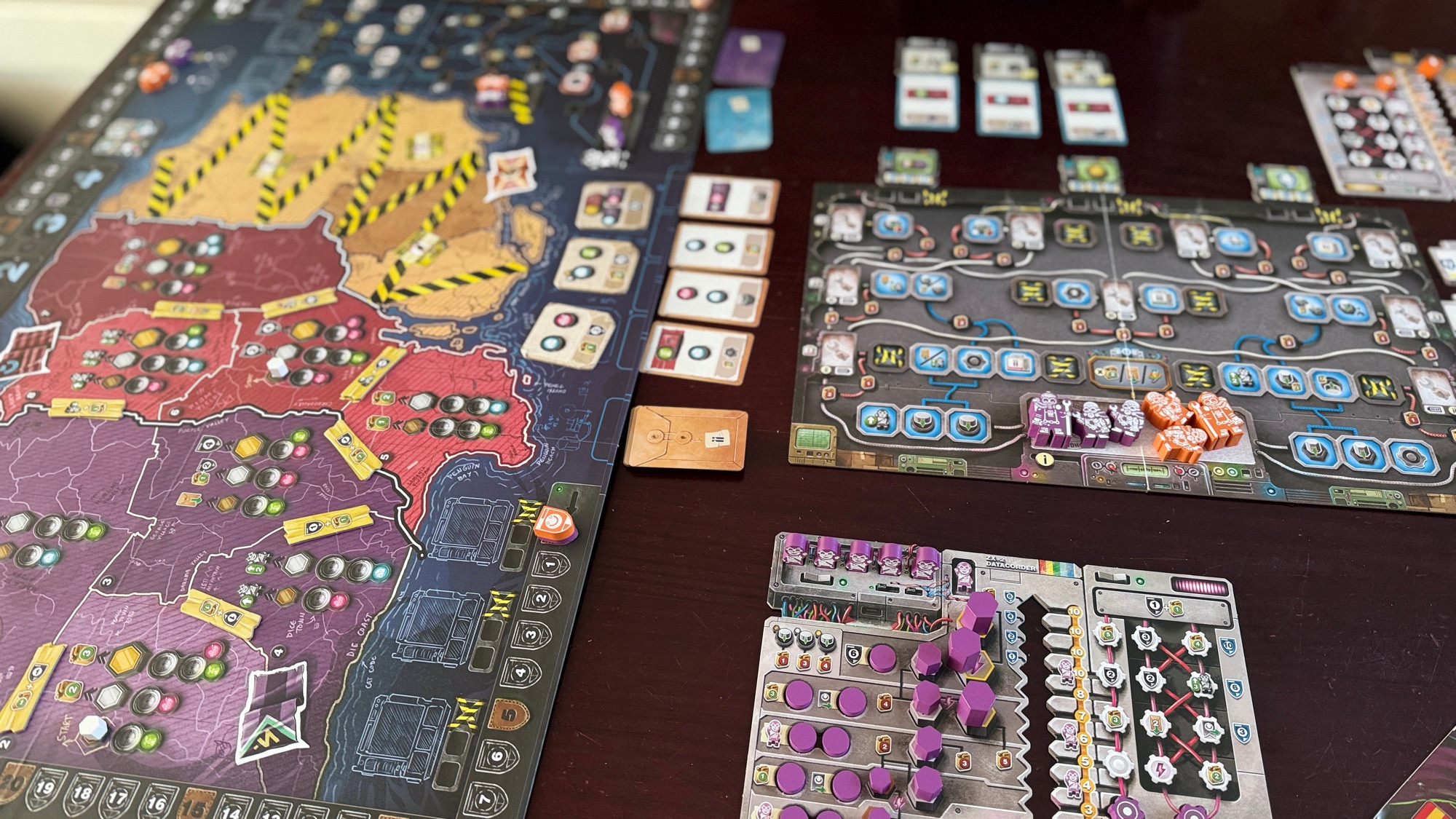 On a également ressorti Dominations (article sur le blog), un jeu de 2020, qu’on avait pas mal joué à l’époque à la maison. Il faut se remettre dans les règles, finalement pas trop compliquées. Ce qui est un peu plus pénible, finalement pendant le jeu, c’est l’ensemble des éléments à vérifier pour ne rien oublier dans notre arbre technologique à la fin des manches. Mais ça tourne toujours bien à 2 joueurs, c’est bien foutu cet arbre de savoirs.