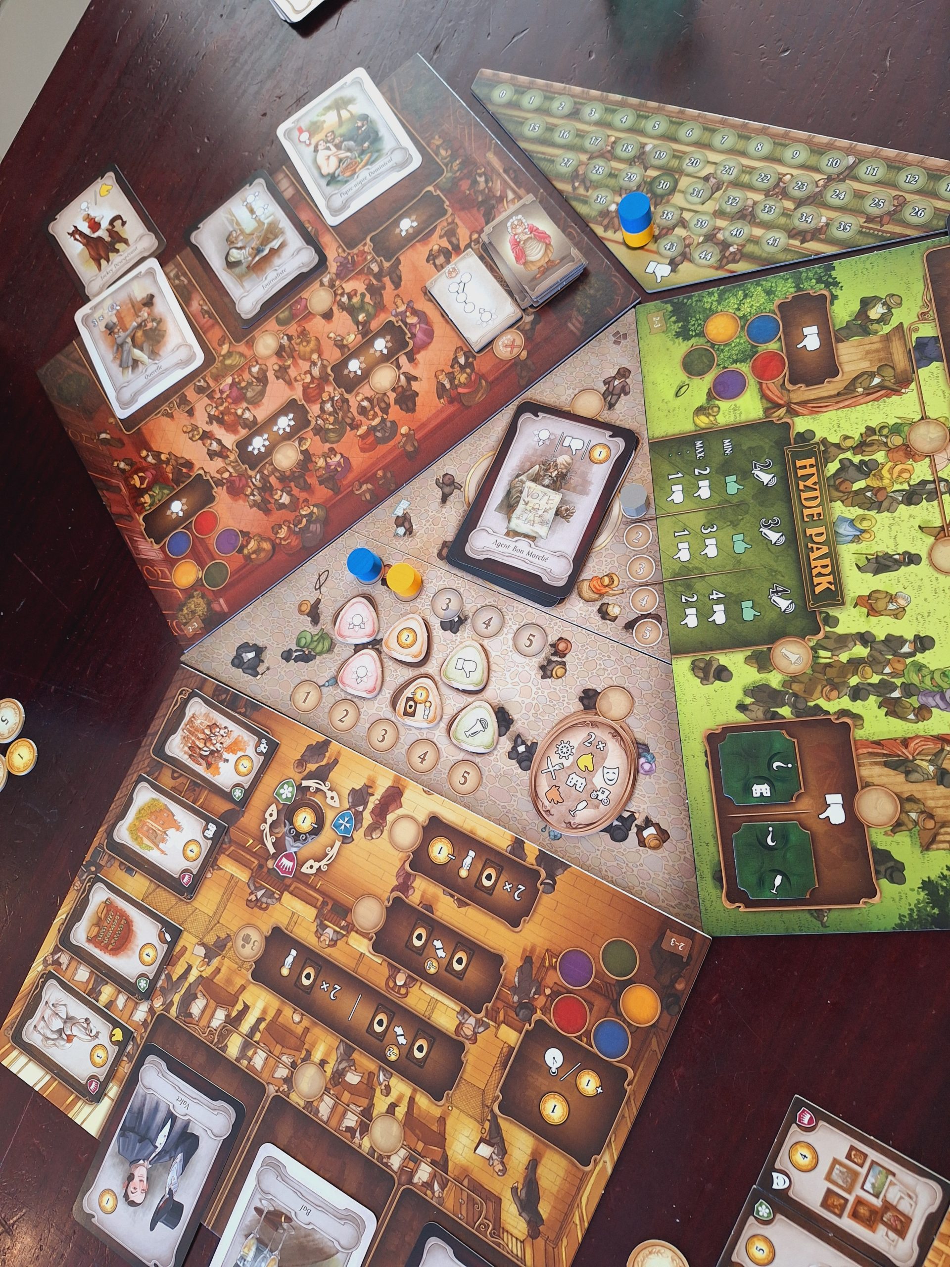 Un autre « vieux » jeu, qui fête ses 10 ans : The prodigals Club. Une fois que vous avez survécu à la mise en place (la règle est vraiment mal fichue je trouve), c’est hyper simple en tour de jeu mais tellement tendu ! c’est un jeu où vous devez finir avec le moins de richesse possible. 3 zones de jeu sont possibles, vous pouvez jouer avec 2 ou 3 des zones. On a décidé de partir sur 3.