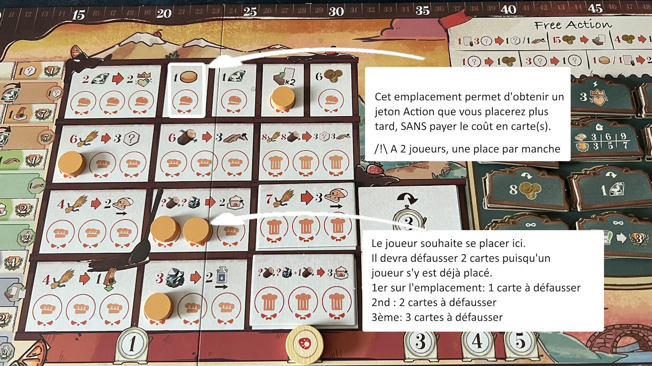 Rappelez vous, à votre tour, en gros, vous posez un jeton Action pour jouer une action du plateau (ça coute des cartes!!!) ou vous jouez une carte.