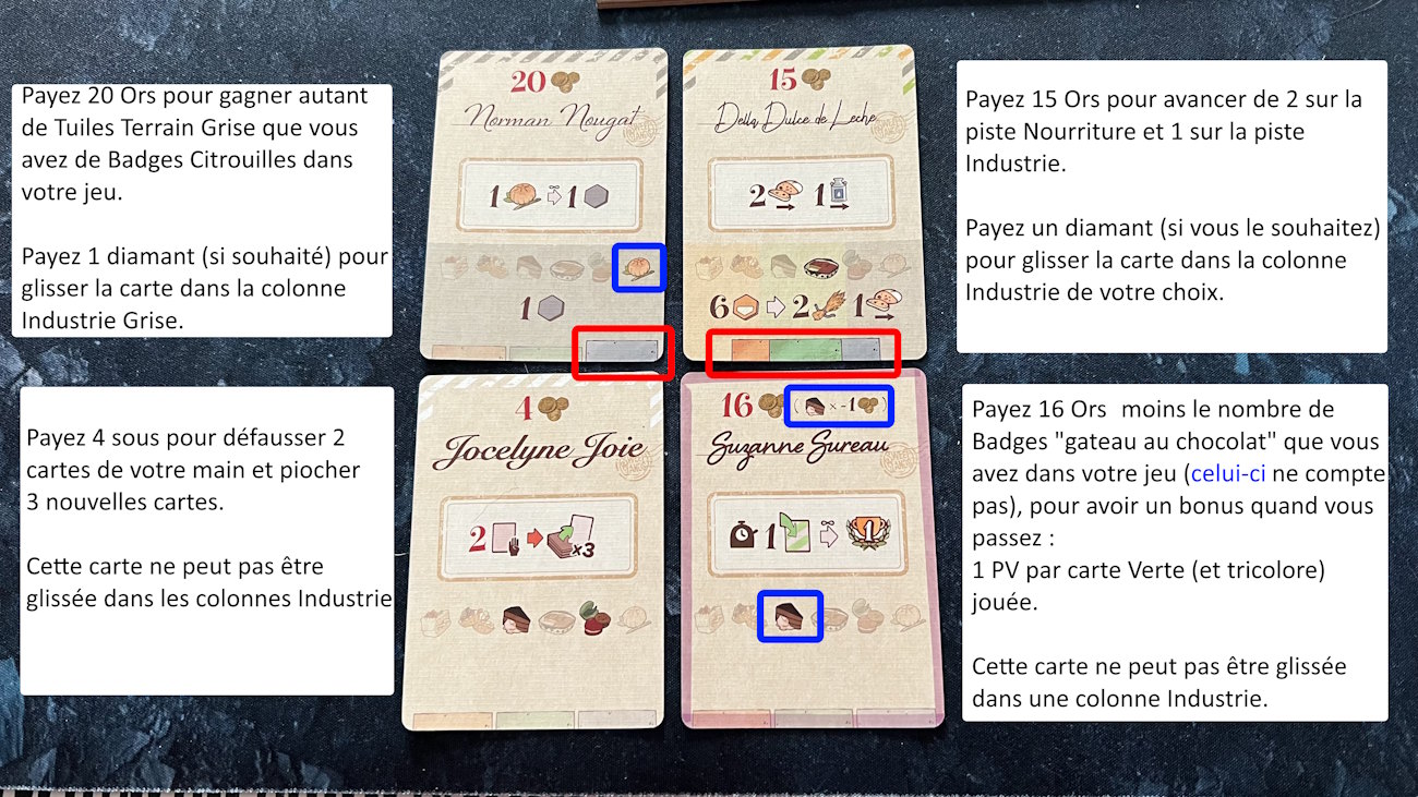 Et comme on aime ça (et l’auteur aussi on pense lol), ces cartes comportent aussi des badges Pâtisserie (comme dans Ark Nova, Terraforming Mars) qui vont vous permettre (parfois, si vous piochez la bonne putain de carte lolll) de gagner des bonus non négligeables ou des réductions de coût des cartes.