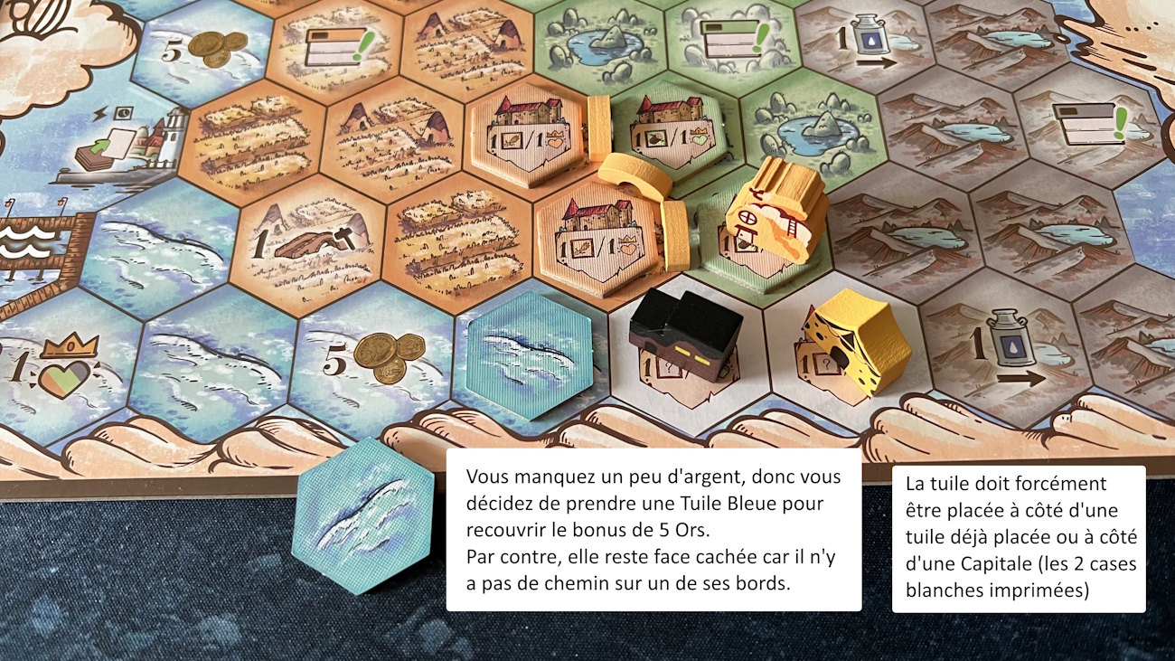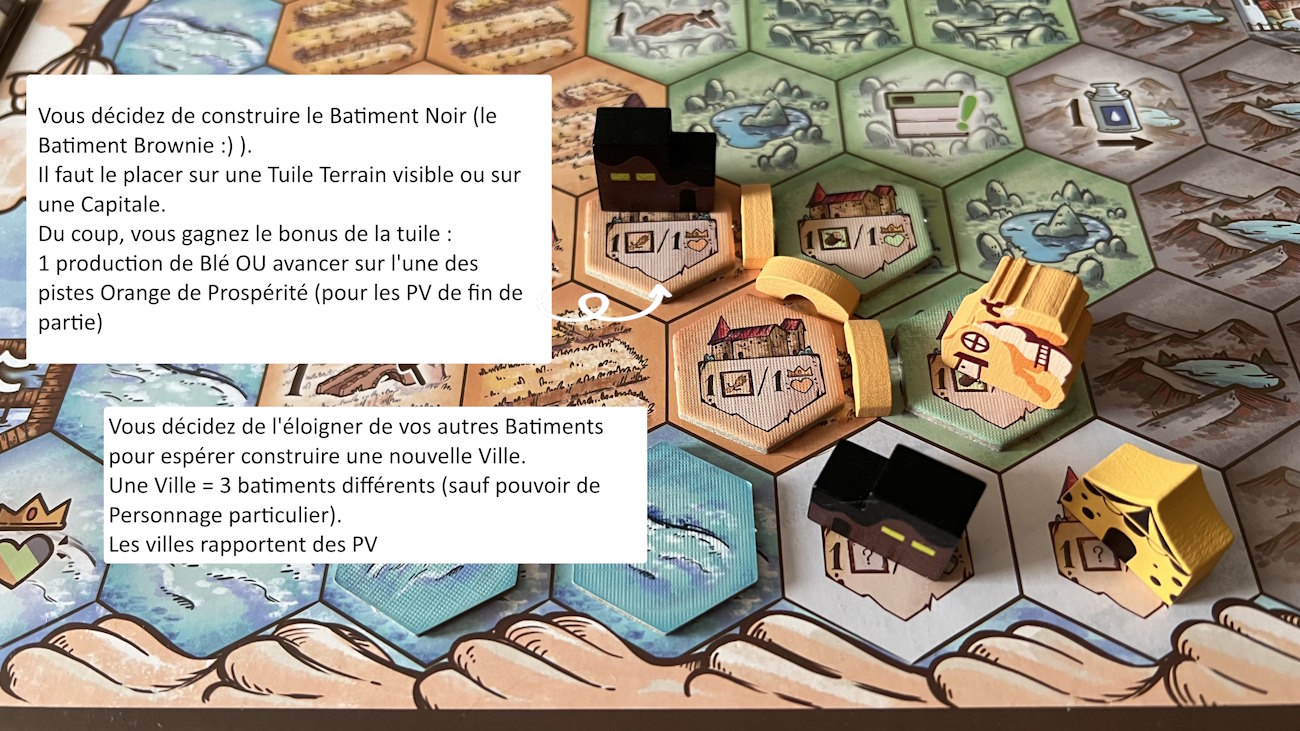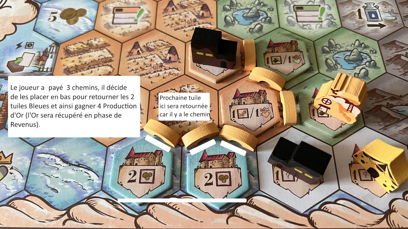 - Développer votre plateau Territoire : en plaçant des chemins, des tuiles et des bâtiments