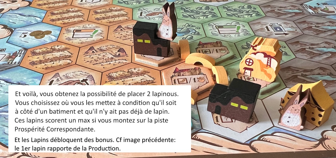 Les cartes apportent soit des bonus immédiats (principalement) soit des bonus quand vous passez (plus rarement). Il n’y a pas de pouvoir permanent. Ca déroute au début d’ailleurs. Les bonus immédiats sont en fait les actions citées ci-dessus et/ou le gain de ressources / tuiles / lapins…
