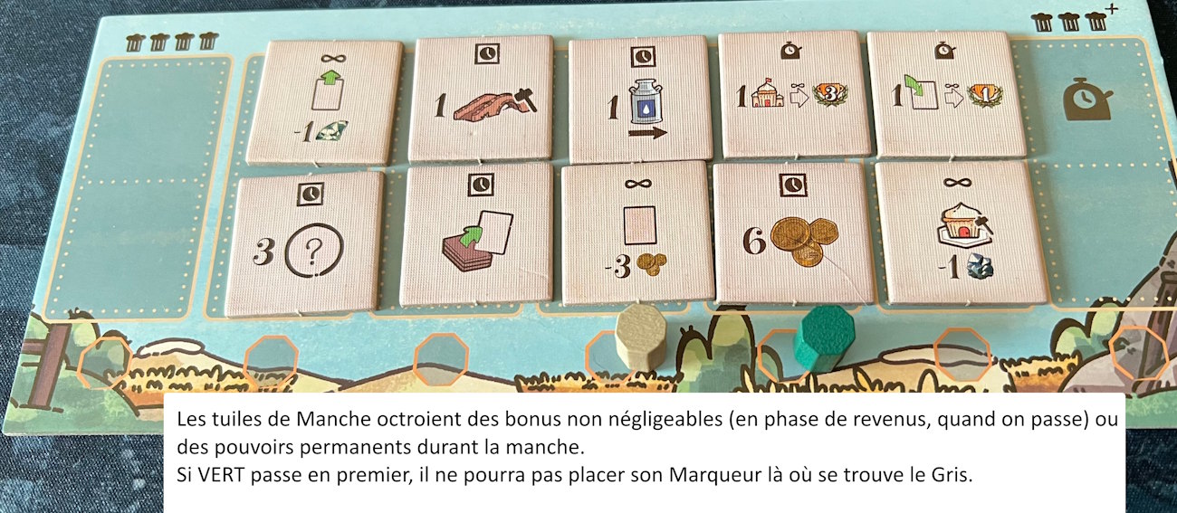 - Choix Cornélien 5 : le placement de notre jeton Manche sous des tuiles à bonus ou pouvoir permanent. Quand vous passez, vous déplacerez votre jeton Manche sous un autre duo de Tuiles à bonus. Evidemment si vous convoitez la place d’un joueur, il devra passer AVANT vous ^^ Ce timing est génial !